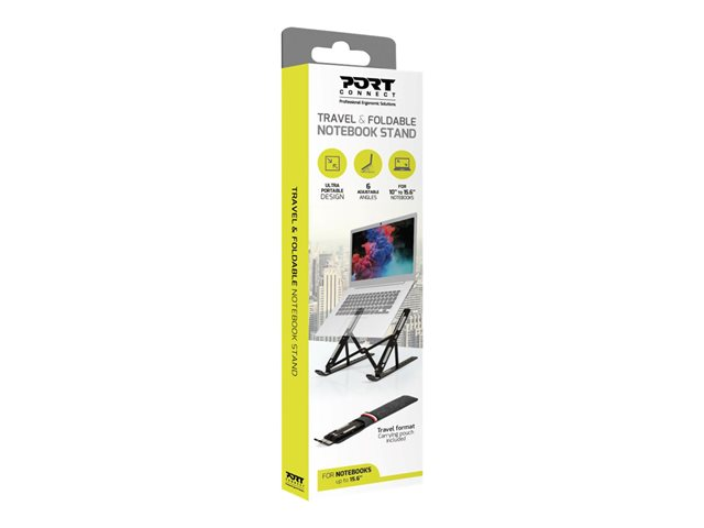 Le support de voyage & pliable pour ordinateur portable de PORT Connect est compatible avec les ordinateurs portables de 10" à 15,6" et la plupart des tablettes. Son design ergonomique donne le choix entre 6 angles différents permettant l'adoption d'une posture confortable et naturelle. Il se transporte facilement dans sa pochette dédiée grâce à sa structure ultra-légère et pliable. De plus, son corps en aluminium entièrement ouvert, dissipant la chaleur, maximise les performances de l'ordinateur portable lors d'une utilisation prolongée. Une sécurité optimale de l'appareil est également assurée grâce à ses crochets de sécurité et ses patins antidérapants.