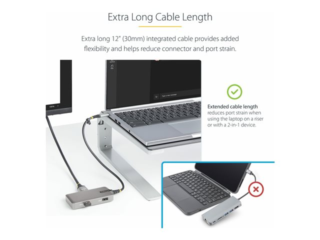 Cet adaptateur multiport USB-C certifié Works With Chromebook (WWCB) prend en charge le HDMI 2.0b (HDR10) jusqu'à 4K 60Hz via le mode DP Alt. La station d'accueil USB-C convertit un ordinateur portable ou une tablette USB-C, comme un Chromebook, un Dell XPS ou un MacBook, en une station de travail. L'adaptateur se connecte au port USB-C, USB4 ou Thunderbolt 3/4 de votre ordinateur hôte. Il dispose d'une sortie vidéo HDMI et d'un hub USB à 3 ports (1x USB 3.2 Gen 1 5Gpbs, 2x USB 2.0 480Mbps). Connectez une alimentation USB-C pour ordinateur portable au port USB Power Delivery (PD) 3.0 dédié, situé sur l'adaptateur multiport, pour charger l'ordinateur portable. L'adaptateur multiport est doté d'un câble hôte USB-C intégré extra-long de 30 cm.